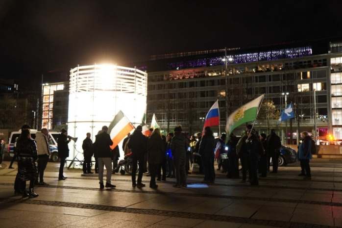 Beide Veranstaltungen zogen zu Beginn jeweils etwa 50 Teilnehmende an. Etwa die gleiche Anzahl an Personen beteiligte sich an der Protestaktion von Volker Beiser, Ex-NPD-ler und Kopf der „Bürgerbewegung Leipzig 2021“, der auf der Opernseite Stellung bezogen hatte. Zu wenig Menschen für zu viele Fahnen, genauer Reichsflaggen, wie die Polizei verkündete. Den Auflagen nach wäre pro 25 Demonstrierenden eine schwarz-weiß-rote Flagge zugelassen.