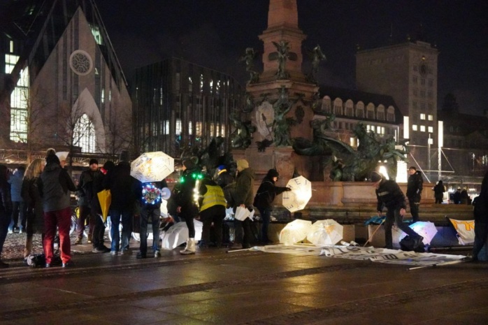 Im Gegensatz zum letzten Montag, an dem die Großaktion „Leipzig leuchtet“ das abendliche Stadtbild prägte (LZ berichtete), traten heute auch die einschlägigen Protest-Organisator/-innen aus dem Querdenken- und rechtspopulistischen Spektrum auf den Plan. Auf dem Augustusplatz waren im Vorfeld zwei Demonstrationen angemeldet worden.