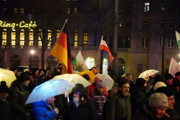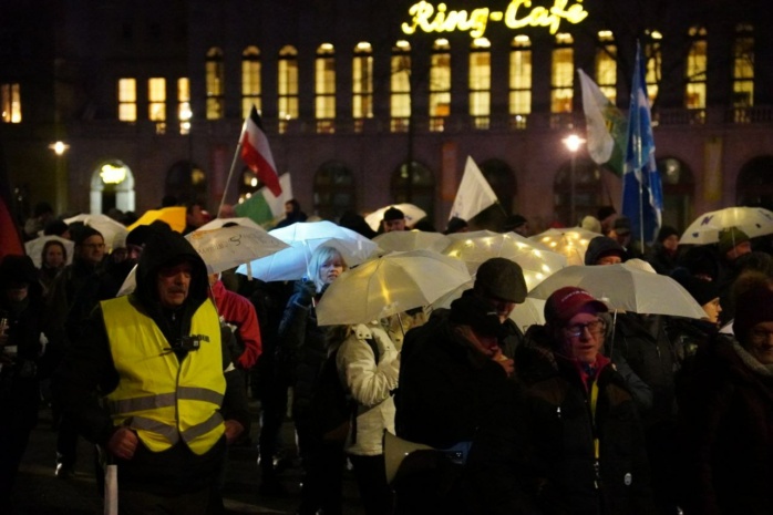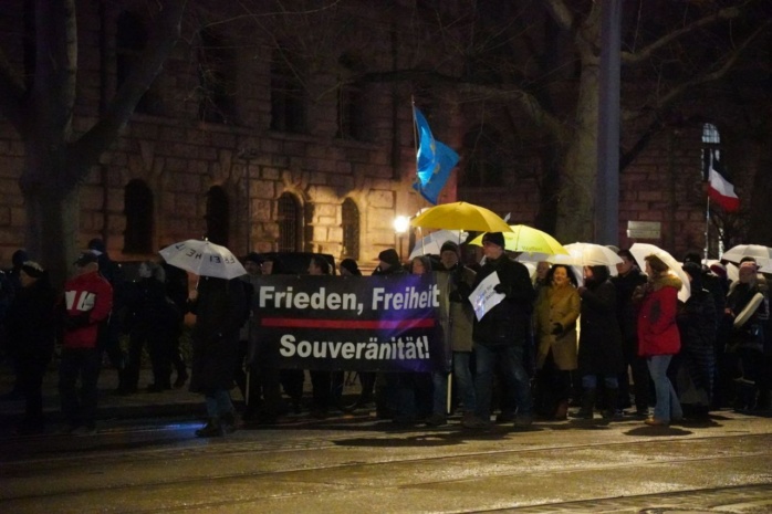 Update, 20.40 Uhr: Gegen 19.30 Uhr marschierten Bernd R. und seine Anhänger/-innen los auf dem Leipziger Ring, dicht gefolgt von Annette H.s Demonstration. Am vorangehenden Zug beteiligten sich etwa 150 Personen. Der Protestmarsch wurde zwischenzeitlich unterbrochen von einer Sitzblockade des Gegenprotests.