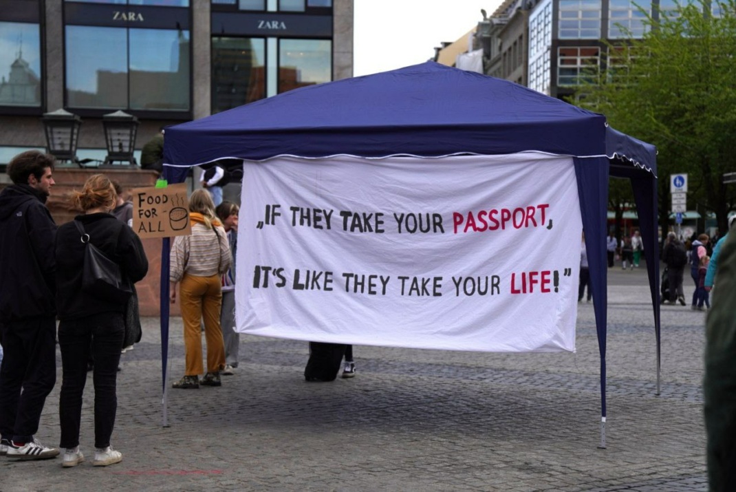 Derweil fand auf dem Markt eine Demo unter dem Motto „Gleiche Rechte, egal welcher Pass – Asylbewerberleistungsgesetz abschaffen!“ statt. Rund 100 Teilnehmer*innen waren mit Plakaten vor Ort. Sie kritisieren unter anderem die Unterbringung in überfüllten Lagern, eine unzureichende Gesundheitsversorgung und unterbezahlte Arbeit. Siehe dazu auch den Videobeitrag ganz unten am Ende dieses Beitrags.