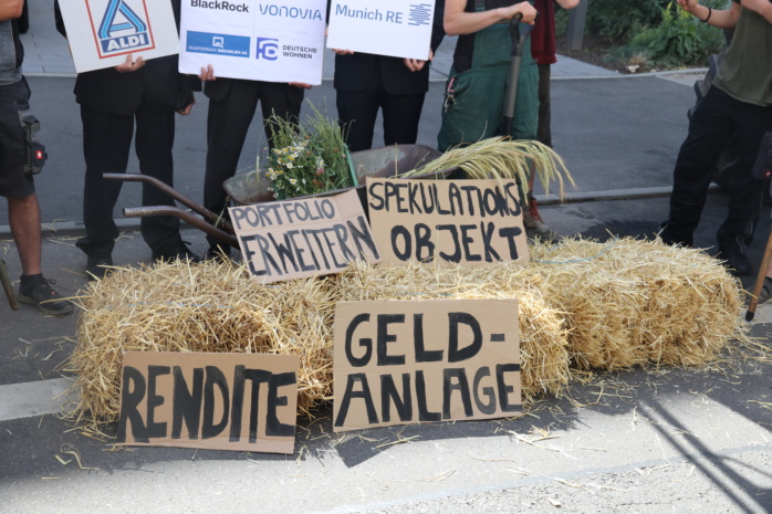 Mit Traktoren und Bannern protestierten heute Bäuerinnen und Bauern der Arbeitsgemeinschaft bäuerliche Landwirtschaft (AbL) vor dem Firmensitz des Immobilienkonzerns Quarterback Immobilien AG. Anlass war die Verleihung des AbL-Preises „Landgrabber des Jahres“ an Quarterback am Vormittag.