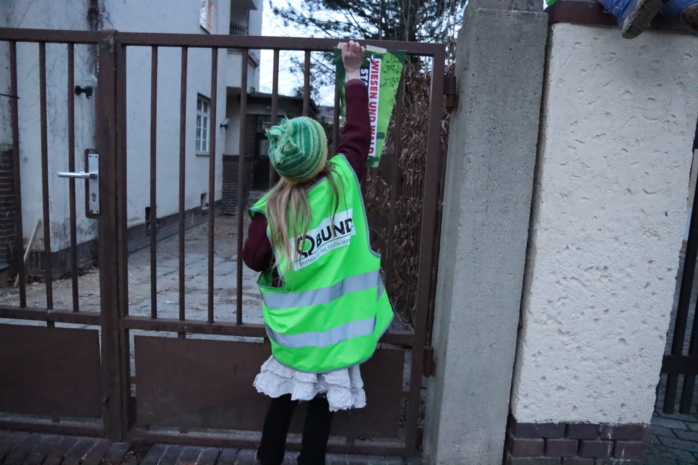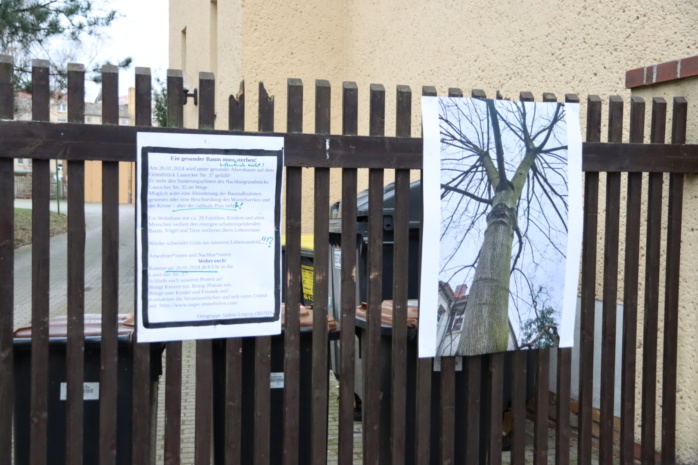 In der Lausicker Straße in Leipzig-Stötteritz kamen am Nachmittag einige Menschen zum Protest gegen eine geplante Baumfällung zusammen. Dazu aufgerufen hatte der BUND Leipzig, in dessen Mitteilung es heißt: „Die Entscheidung zur Fällung steht im Konflikt mit dem Baumschutz und würde den Verlust eines lebendigen Lebensraums für die Anwohner*innen zur Folge haben.“