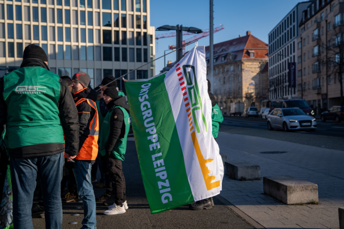 Wie an vielen anderen Orten Deutschlands versammelten sich GDL-Mitglieder am Mittwoch auch in Leipzig zur Streikkundgebung. Gegen 10:30 Uhr traten rund 60 streikende Eisenbahner*innen vor den Leipziger Hauptbahnhof, gekleidet in grünen GDL-Westen und mit Plakaten und Fahnen ausgestattet. Unter ihnen sind nicht – wie der Name der Gewerkschaft vermuten lässt – nur Lokführer*innen, sondern auch Zugbegleiter*innen, Disponent*innen, Ausbilder*innen, Werkstattmitarbeiter*innen und Fahrdienstleiter*innen.
