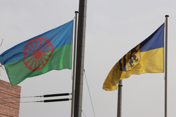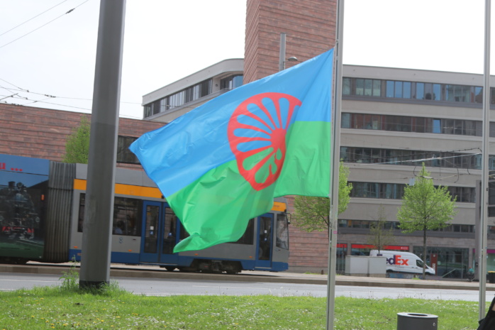 Vor dem Neuen Rathaus wurde am Nachmittag wieder die Roma-Flagge gehisst. Anlass ist der Internationale Tag der Roma und Romnja. Gjulner Sejdi, Vorsitzender des Vereins „Romano Sumnal“, und Sozialbürgermeisterin Martina Münch hielten dabei kurze Großworte.