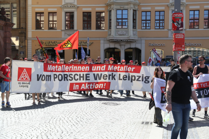 Zum internationalen Arbeiter*innenkampftag demonstrierten Gewerkschaften und politische Gruppen in Leipzig. Der Deutsche Gewerkschaftsbund (DGB) Region Leipzig-Nordsachsen traf sich 10 Uhr im Clara-Zetkin-Park zu einer Fahrrad-Demo. Ab 10:30 Uhr hatte der Gewerkschaftsverbund zudem zu einer Laufdemo ab dem Volkshaus in der Karl-Liebknecht-Straße aufgerufen. Die Demonstrationen trafen sich auf dem Marktplatz mit rund 2.200 Teilnehmenden. Einem Aufruf des Zentralverbands der Deutschen Schornsteinfeger e.V. (ZDS) zur Beteiligung an der DGB-Demo folgend, beteiligten sich unter anderem auch rund 150 Schornsteinfeger*innen.