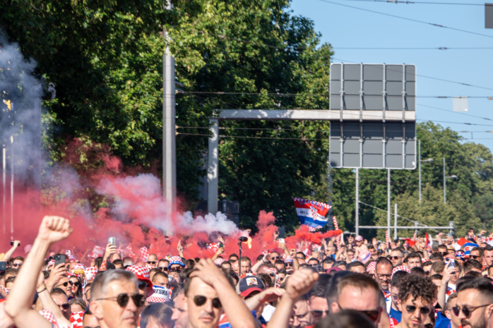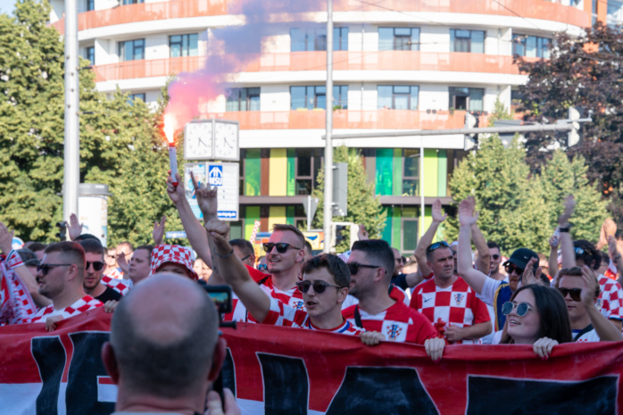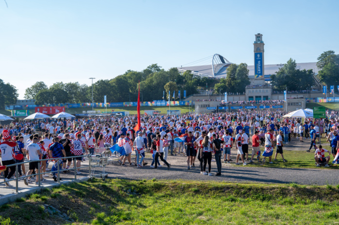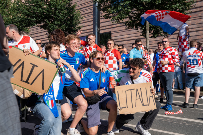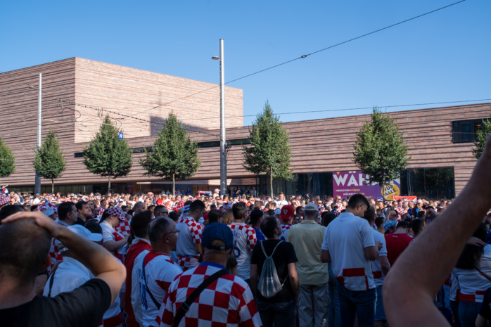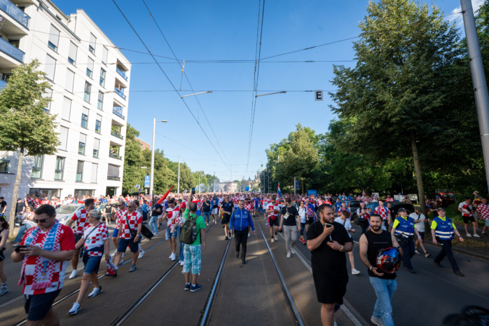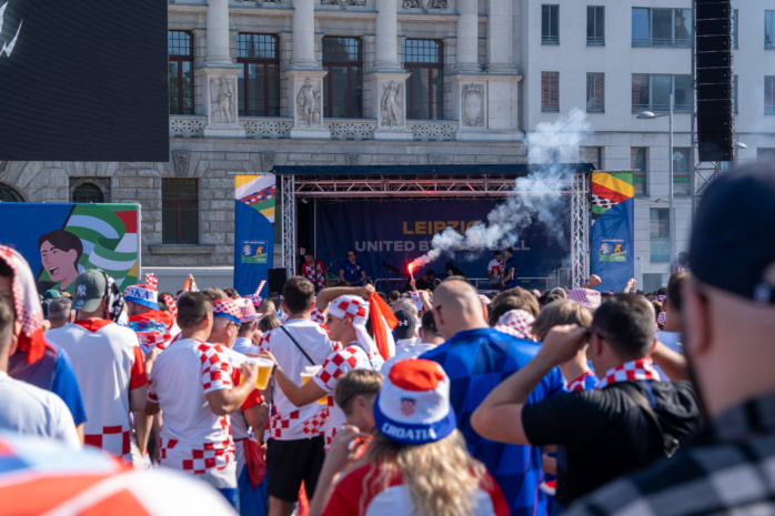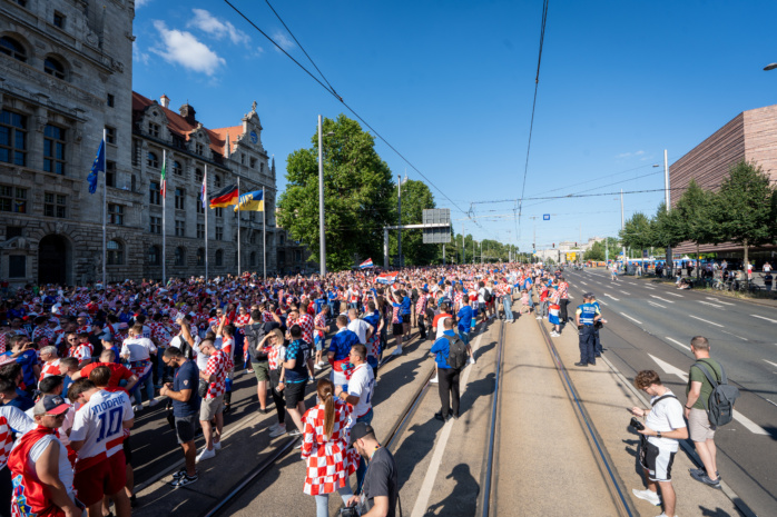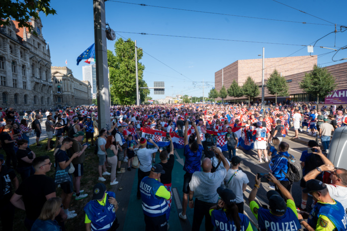 Noch am heutigen Abend, um 21 Uhr, treffen im Rahmen der Fußball-Europameisterschaft in der Red-Bull-Arena die Nationalmannschaften von Italien und Kroatien aufeinander. Für beide Teams ist die Partie entscheidend für den Verbleib im Turnier. Zum Spiel reisten tausende Fans aus beiden Ländern an. Um 17.30 Uhr startete ein Fanmarsch von Anhänger*innen der kroatischen Mannschaft vom Wilhelm-Leuschner-Platz aus in Richtung Stadion.
