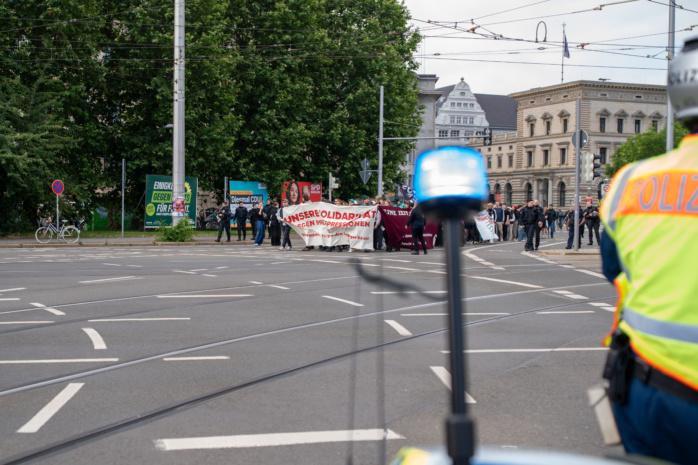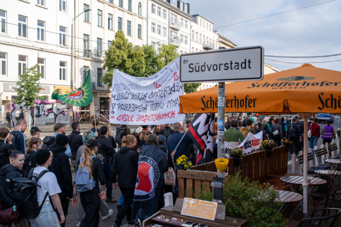 Laut Angaben der Polizei beteiligten sich etwa 400 Personen an dem Aufzug, der nach einer Kundgebung auf dem Rathausvorplatz geschlossen über die Karli durch die Südvorstadt bis zum Wiedebachplatz führte.