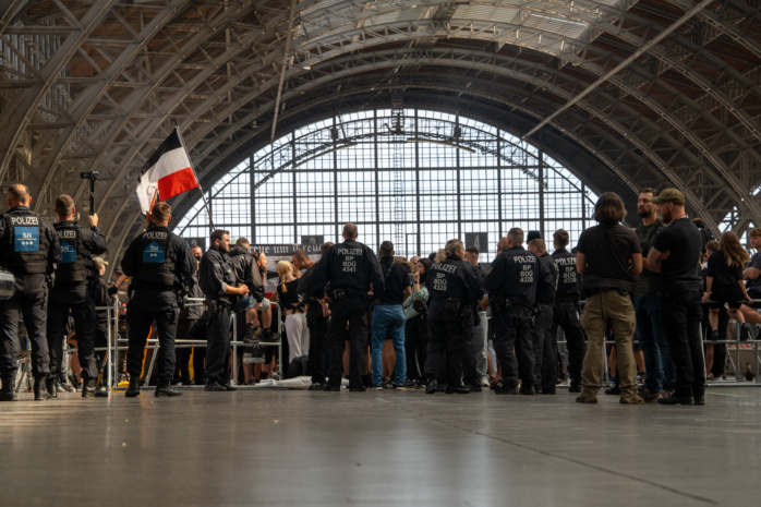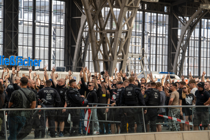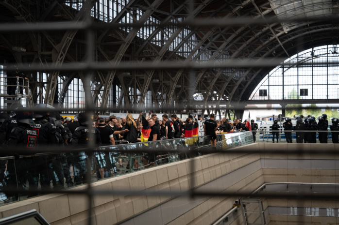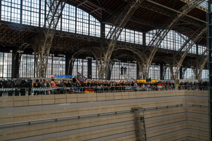Im Bericht der Behörde heißt es dazu: „. Diese Personen zeigten ein versammlungstypisches und teilweise aggressives bzw. militantes Verhalten.“ Vor dem Bahnhofsgebäude versammelten sich derweil hunderte Personen zu zwei angemeldeten Gegendemonstrationen. Zwei weitere Spontandemonstrationen, die sich ebenfalls gegen die rechtsextremistische Versammlung richteten, fanden auf den Gleisen sechs und sieben statt.