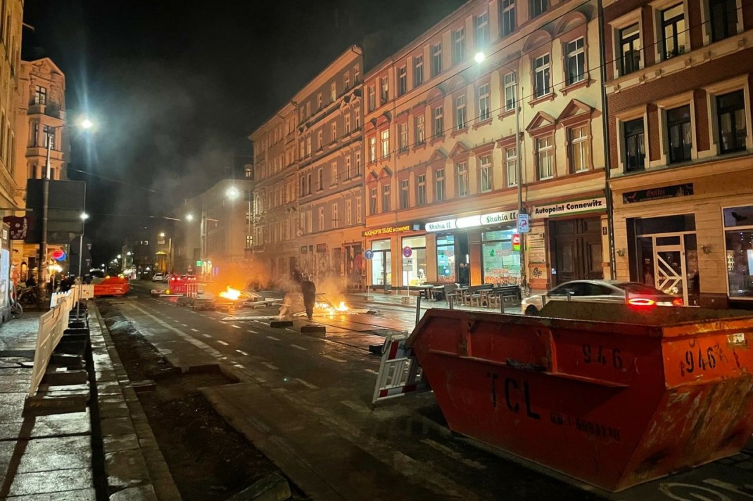Nur einen Tag später, am Samstagabend gegen 22.30 Uhr, stellte eine Gruppe unbekannter Personen einen leeren Baucontainer auf die Wolfgang-Heinze-Straße, wodurch auch das Gleis der Straßenbahn blockiert wurde. Nachdem Passanten den Container zur Seite geschoben hatten, räumte die Gruppe ihn erneut auf die Straße.
