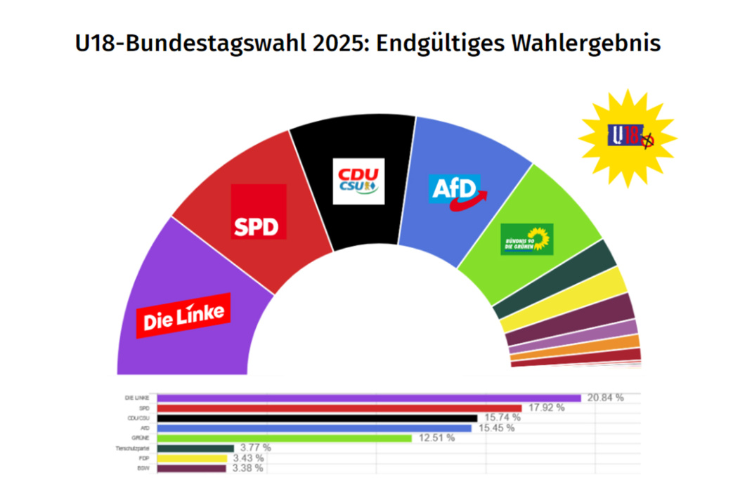 Eine Woche lang konnten Kinder und Jugendliche abstimmen: Bei der U18-Wahl im Vorfeld der Bundestagswahl am 23. Februar, erhielt die Partei Die Linke mit 20,8 Prozent die meisten Stimmen. Auf dem zweiten Rang folgte die SPD mit 17,9 Prozent, CDU/CSU erreichten mit 15,7 Prozent den dritten Platz.