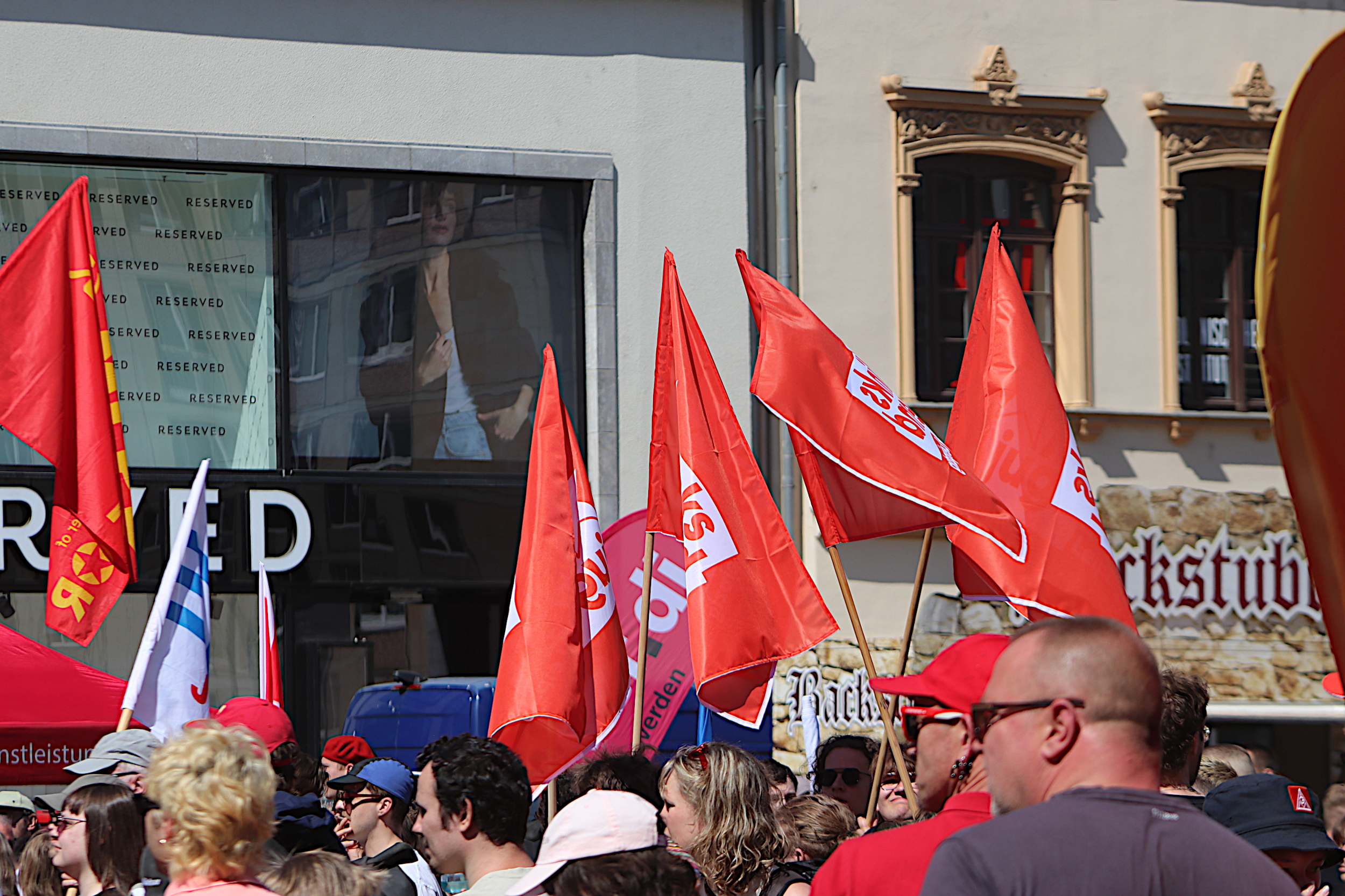 Wie zu erwarten, hatten auch in Leipzig mehrere Gruppierungen und Organisationen dazu aufgerufen, am heutigen „Tag der Arbeit“ für politische Anliegen auf die Straße zu gehen. Den Auftakt bildete eine Demo des Deutschen Gewerkschaftsbundes (DGB), die auch durch die Linkspartei unterstützt wurde. Geschätzt mehrere hundert Personen zogen kurz nach 10:30 Uhr vom Volkshaus und über einen Teil des Rings auf den Marktplatz. Unter dem Motto „Mach dich stark mit uns!“ war dort ab 12 Uhr eine Kundgebung angemeldet.