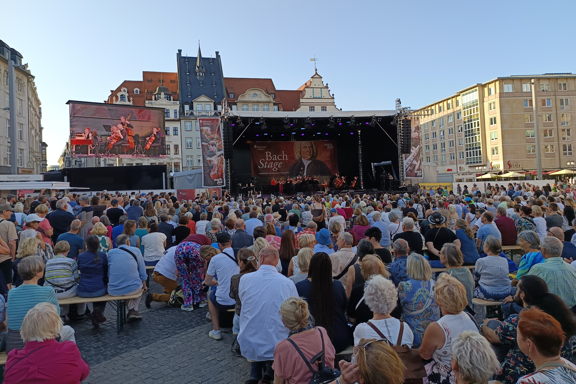 In Leipzig läuft auch das Bachfest mit diversen Formaten. So konnten Besucher am Samstagabend kostenfrei auf dem Markt das Stuttgarter Kammerorchester bestaunen, welches eine Fusion von Vivaldi, Bach und Iron Maiden bot.