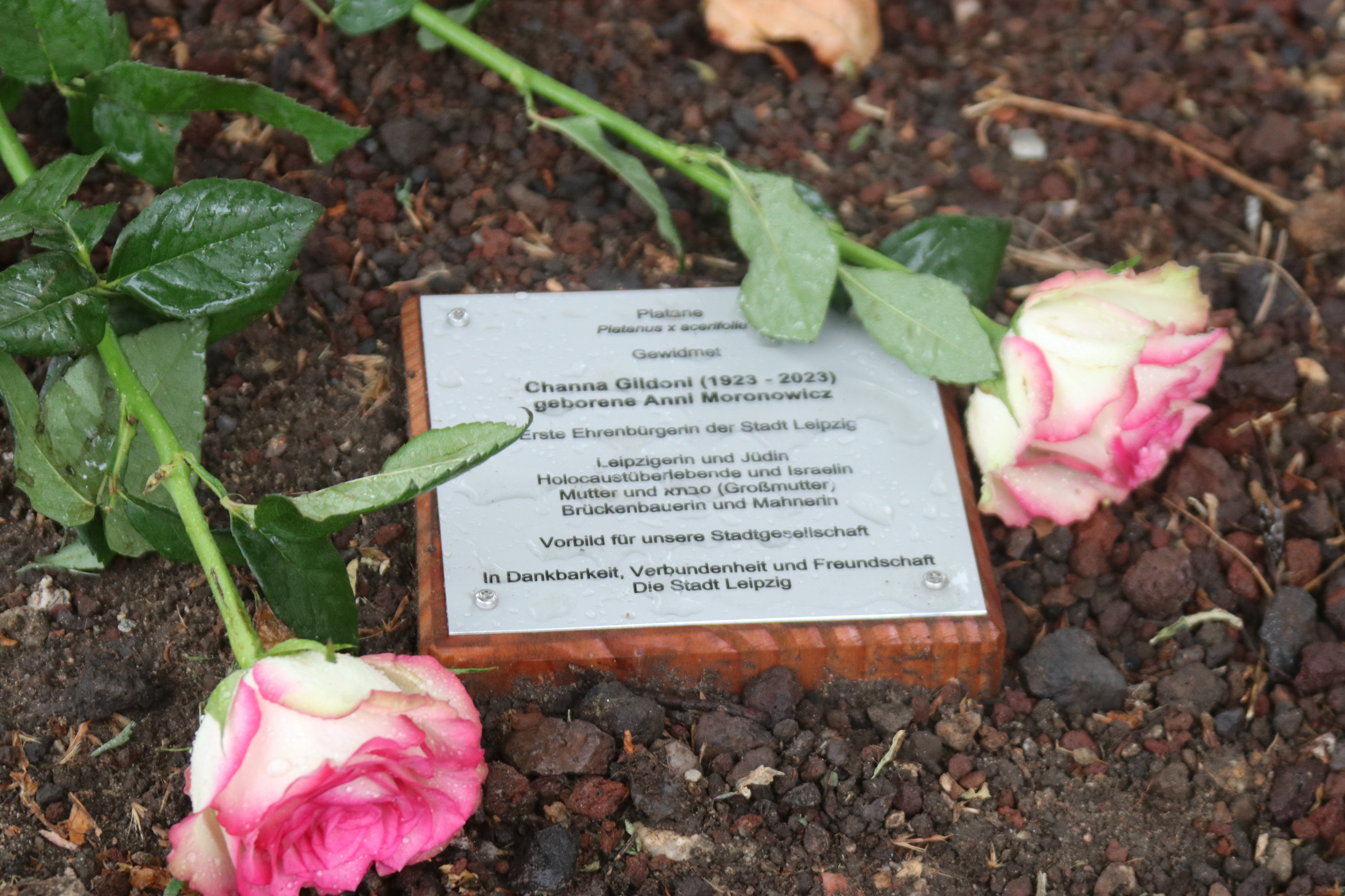 In der Gottschedstraße fanden sich geschätzt zwischen 60 und 80 Menschen trotz einsetzenden Gewitterregens zusammen, um der Einweihung einer Gedenktafel für die Holocaust-Überlebende und erste Leipziger Ehrenbürgerin Channa Gildoni (1923–2023) beizuwohnen.