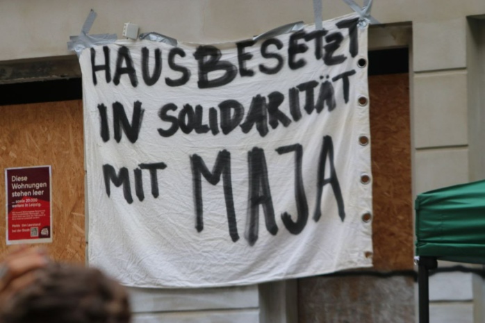 Zuvor war gegen 07:45 Uhr eine Eilversammlung „Solidarität mit Hausbesetzung Bernhardstr. 28“ angemeldet worden, die laut Polizei auf bis zu 70 Personen anwuchs. Es gab Musik und Redebeiträge, in denen man sich solidarisch mit Maja T. zeigte. Die sich als non-binär identifizierende Person aus Deutschland soll sich Anfang 2023 in Budapest an Gewaltattacken auf mutmaßliche Neonazis beteiligt haben und sitzt in ungarischer Haft.