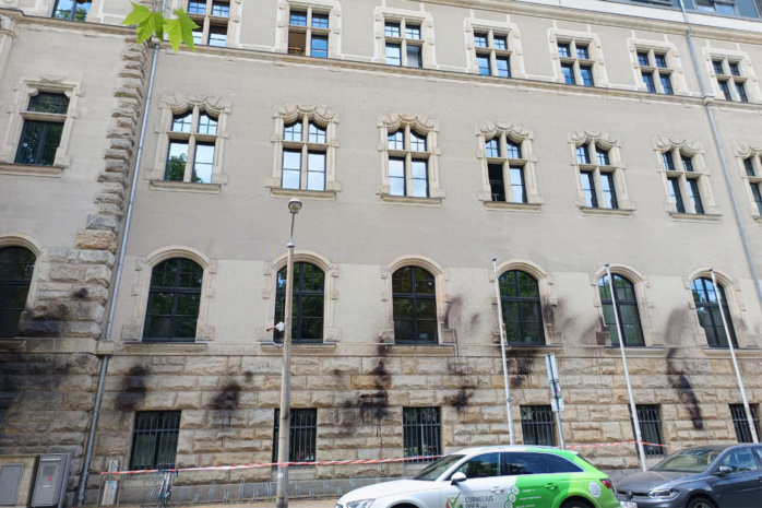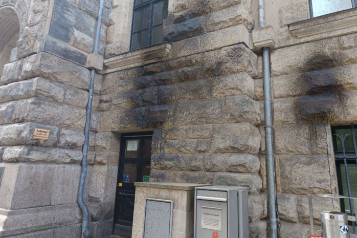 Unbekannte Täter*innen verursachten in der Nacht von Sonntag auf Montag Schäden am Gebäude des Leipziger Amtsgerichts in der Bernhard-Göring-Straße. Mit schwarzem Pech wurde die Fassade des Hauses besprüht, eine Tür und ein Fenster beschädigt.