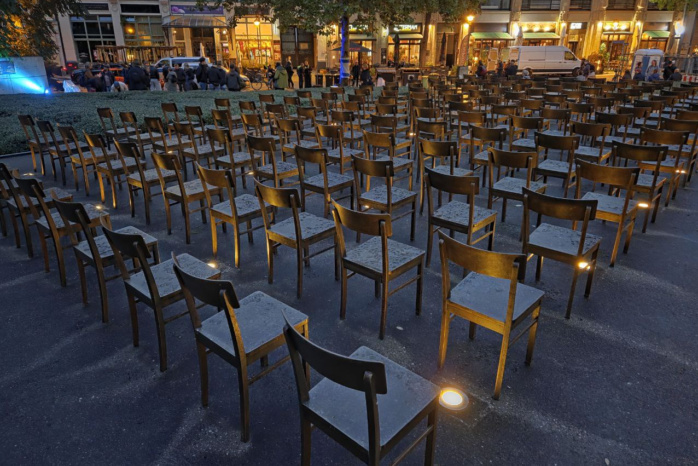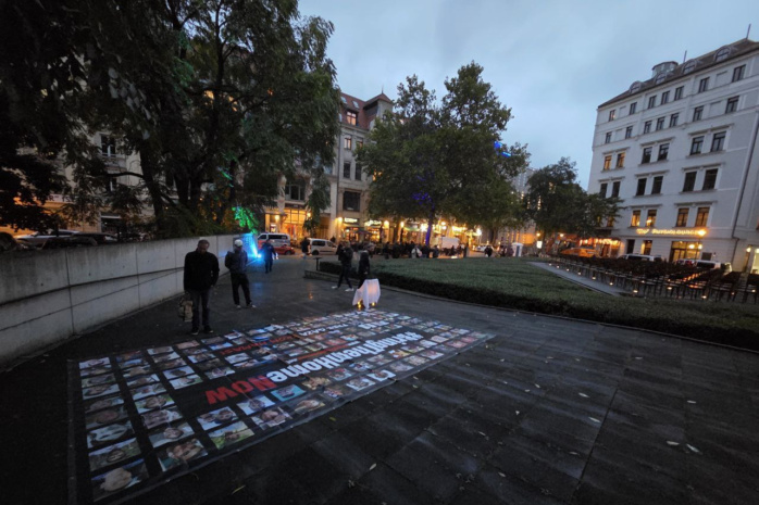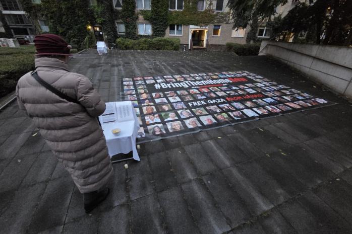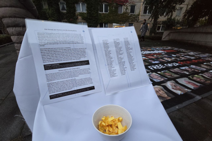 Nach vorläufiger Schätzung versammelten sich hier 200 Menschen. Vor Ort wurde ein Schabbat-Tisch aufgestellt, fünf wegplatzierte Stühle sollen symbolisch an die Menschen erinnern, die nicht mehr dabei sein können. Auf ihnen sind Erinnerungen an das Massaker zu lesen und Namen von Opfern. Dazu wurde gebetet.