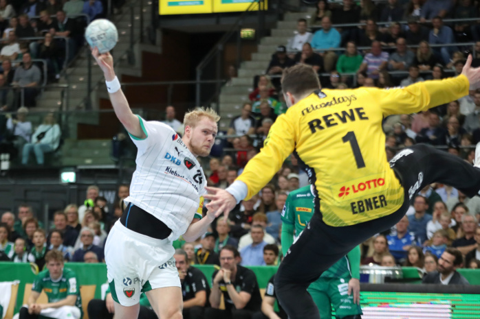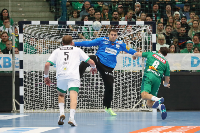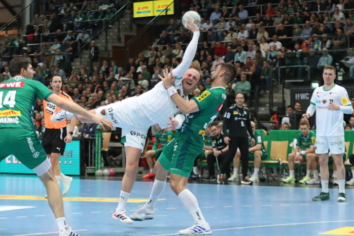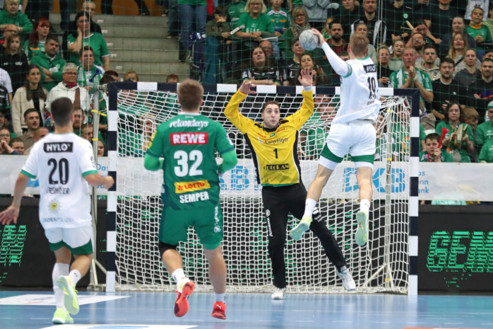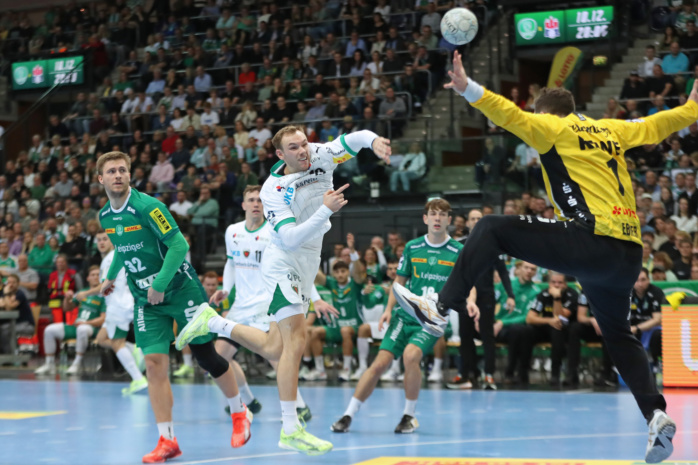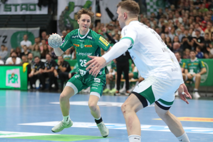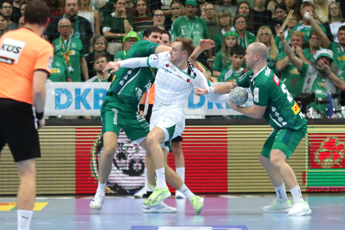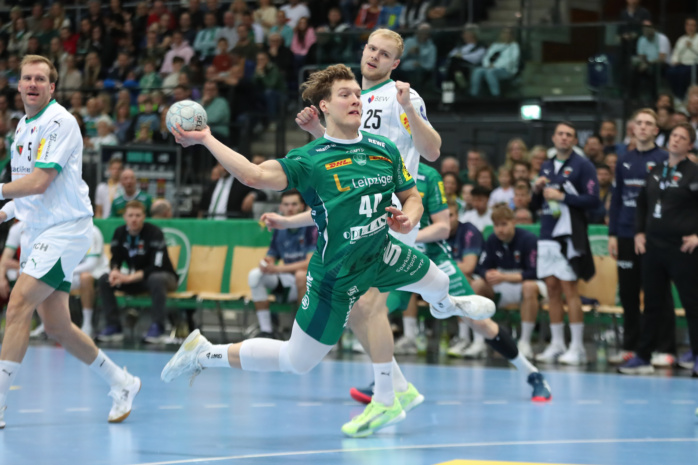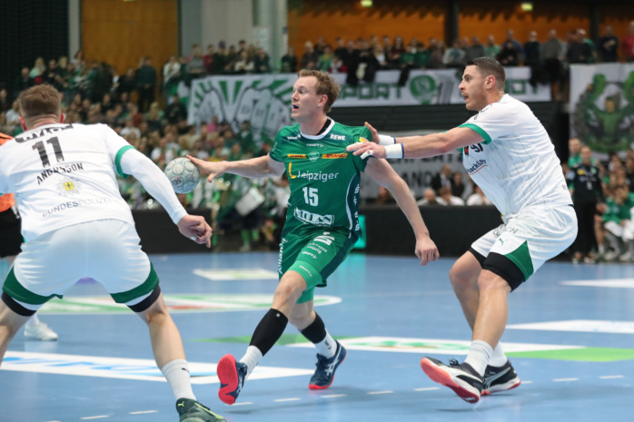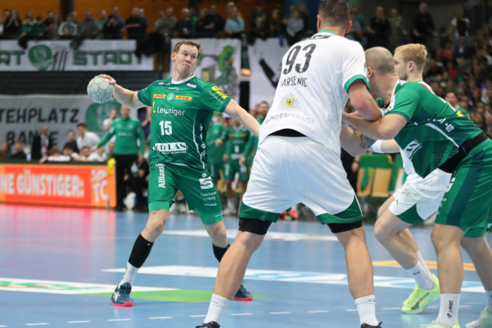 Doch vor 4.875 lautstarken Handballfans ließen die Grün-Weißen gegen den Favoriten aus Berlin ihr Herz auf der Platte. In der ersten Viertelstunde agierten sie voll auf Augenhöhe. Dann gab es mit einer harten Rot-Entscheidung gegen William Bogojevic einen ersten Dämpfer. Torhüter Domenico Ebner hielt seine Leipziger aber mit starken Paraden im Spiel. Der Halbzeitstand von „nur“ 12:15 machte weiterhin Hoffnung auf Zählbares.
