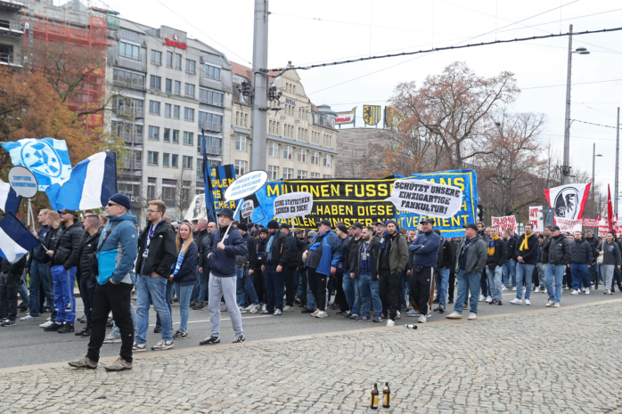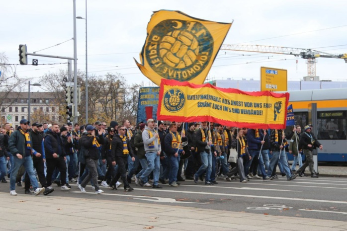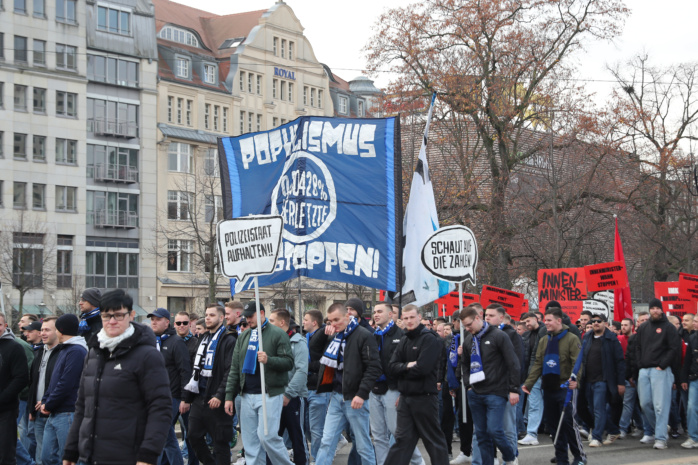 Groß-Demonstration der Fußball-Fanszenen Deutschlands unter dem Motto: "Der Fußball ist sicher! Schluss mit Populismus – Ja zur Fankultur!" am 16.11.2025, Innenstadtring Leipzig. Foto: Lucas Böhme