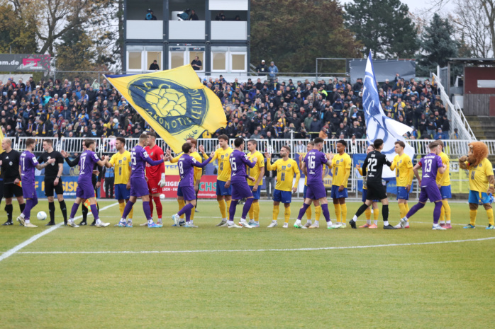 Beide Teams begrüßen sich vor Anpfiff auf dem Rasen. Foto: Jan Kaefer