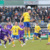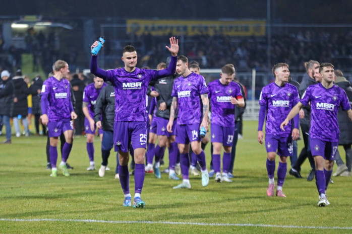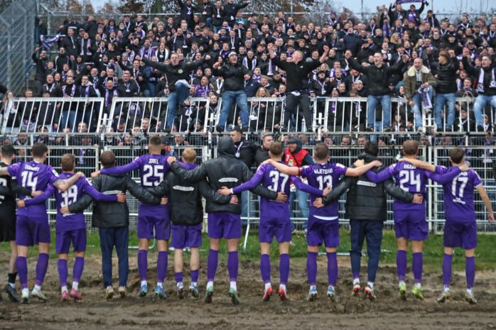 Das Team von Aue feiert vor seinem Fanblock das Weiterkommen. Foto: Jan Kaefer
