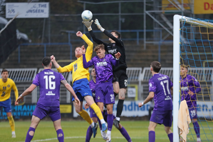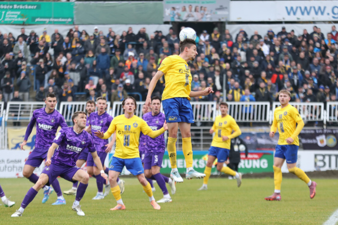 Lukas Wilton (5, Lok Leipzig), Paul Seidel (37, Erzgebirge Aue) und Torwart Louis Lord (22, Erzgebirge Aue) springen nach dem Ball. Foto: Jan Kaefer
