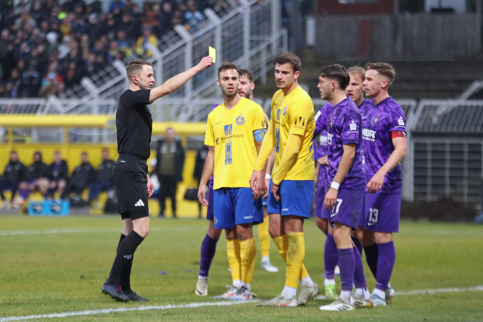 Schiedsrichter Michael Näther zeigt die Gelbe Karte. Foto: Jan Kaefer