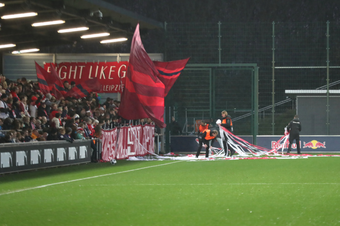 Die Torjubel-Papierschlangen aus dem RB Leipzig-Fanblock müssen von den Ordnern beräumt werden. Foto: Jan Kaefer