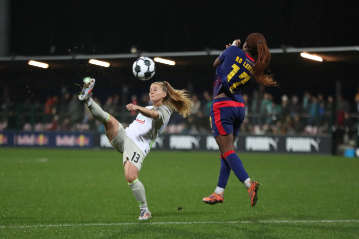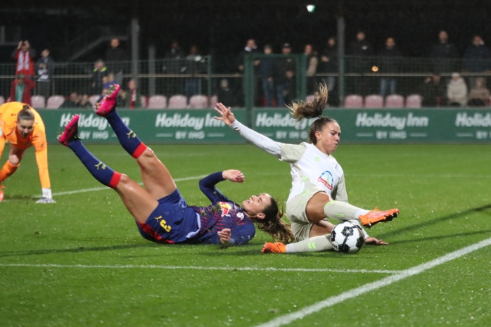 Andrea Norheim (3, RB Leipzig) kann die riesige Chance für Maja Sternad (11, Werder Bremen) stoppen. Foto: Jan Kaefer