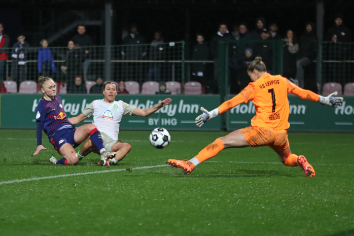 Torschuss von Larissa Mühlhaus (7, Werder Bremen) gegen Victoria Krug (20, RB Leipzig) und Torwart Elvira Herzog (1, RB Leipzig). Foto: Jan Kaefer