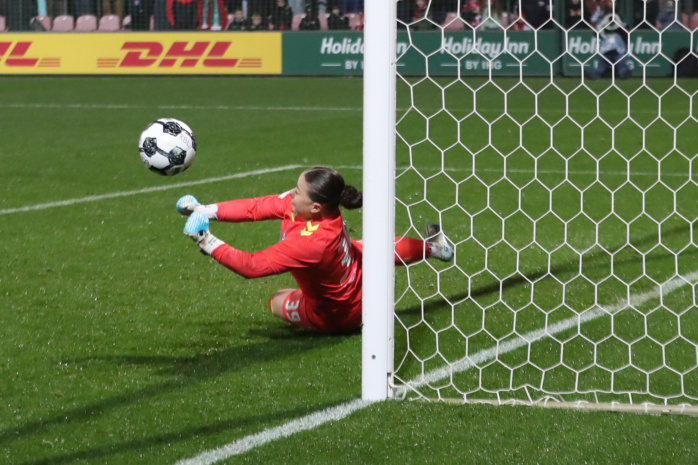 Torwart Mariella El Sherif (39, Werder Bremen) hält den entscheidenden Schuss im Elfmeterschießen. Foto: Jan Kaefer