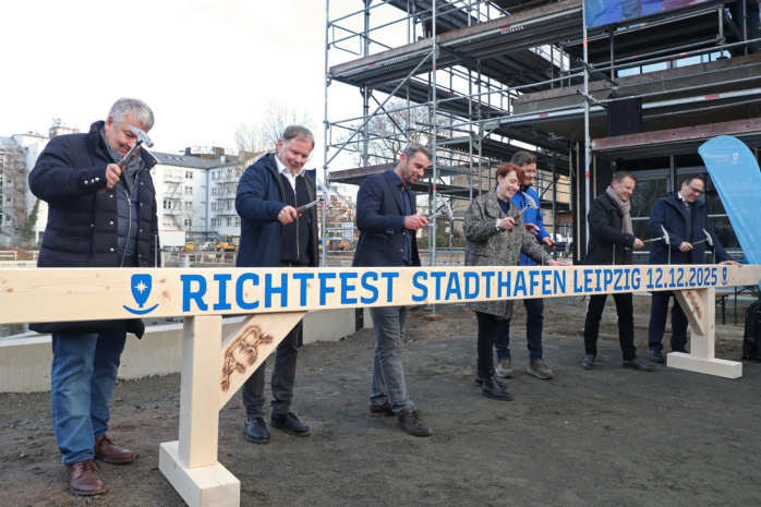 Viel Trubel gab es heute Mittag am Stadthafen Leipzig in der Schreberstraße. Geschäftsführung und Mitarbeitende feierten hier mit rund 120 Gästen aus Politik, Verwaltung, Wirtschaft und Tourismus sowie mit Vertretern der bauausführenden Unternehmen Richtfest für das neue Servicegebäude.