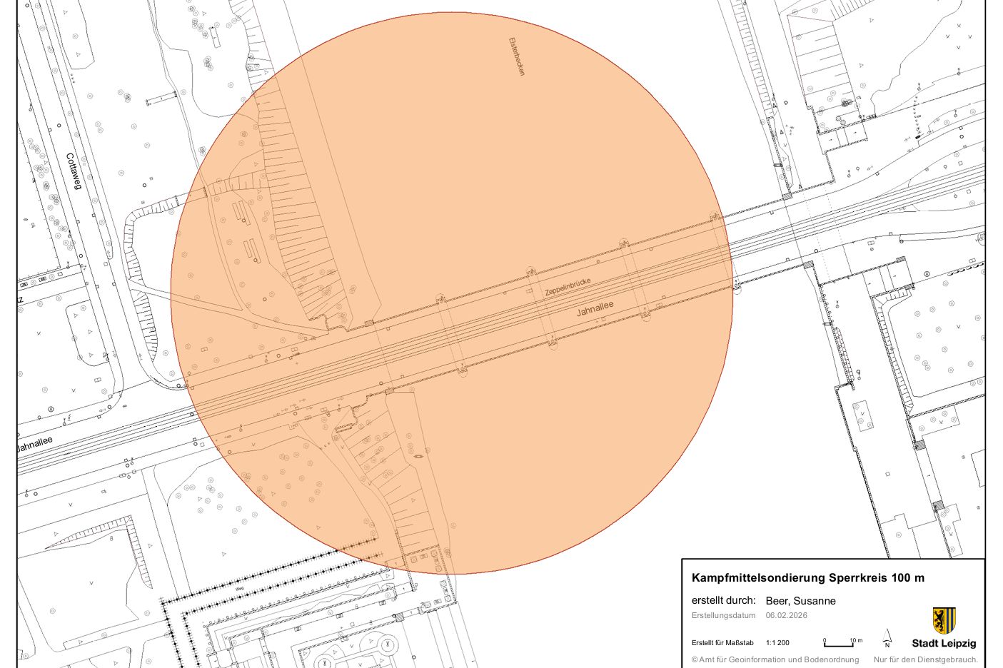 Diese wird ihre Arbeit am kommenden Mittwoch, dem 11. Februar, verrichten. Aus Sicherheitsgründen wird an diesem Tag um den Fundort herum ein Sperrkreis von 100 Metern Durchmesser eingerichtet. Zwischen 8 Uhr und 16 Uhr ist damit für Fußgänger und Verkehrsmittel kein Durchkommen. Die Fuß- und Radwege sind gesperrt und die über die Jahnallee verkehrenden Straßenbahnlinien 3, 7, 8 und 15 werden über Westplatz, Käthe-Kollwitz-Straße und Felsenkeller umgeleitet.