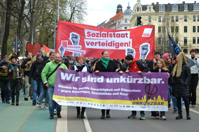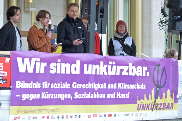 Das neu gegründete Bündnis #unkürzbar Leipzig hatte für den Samstag in der Innenstadt zu einer ersten Demonstration aufgerufen. Initiiert worden war der neue Zusammenschluss vom DGB Leipzig-Nordsachsen, dem Aktionsnetzwerks „Leipzig nimmt Platz“, dem Projektbüro linXXnet und der Partei Die Linke Leipzig sowie Bündnis 90/ Die Grünen Kreisverband Leipzig. Das Bündnis will sich für soziale Gerechtigkeit und Klimaschutz stark machen und gegen Kürzungen, Sozialabbau und Hass eintreten.