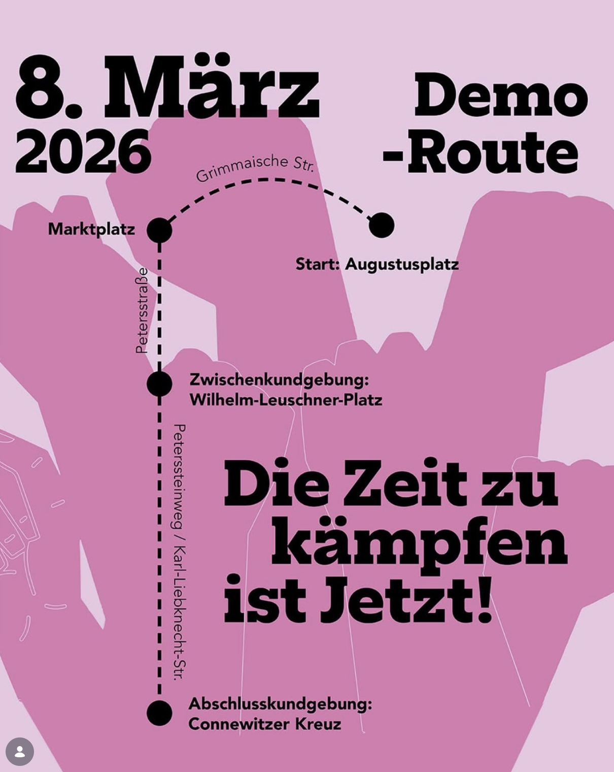 Die eigentliche Demonstration zum Internationalen Frauenkampftag, zu der das Bündnis „8. März ist immer!“ mobilisiert, findet am Sonntag statt. Treffpunkt ist um 14.30 Uhr am Augustusplatz, von dort aus geht es durch die Innenstadt über die Karl-Liebknecht-Straße zum Connewitzer Kreuz. Der Protest ist offen für alle Menschen und im Anschluss an die Demonstration wird im Werk 2 eine feministische Abrissparty mit Musik und DJs angeboten.