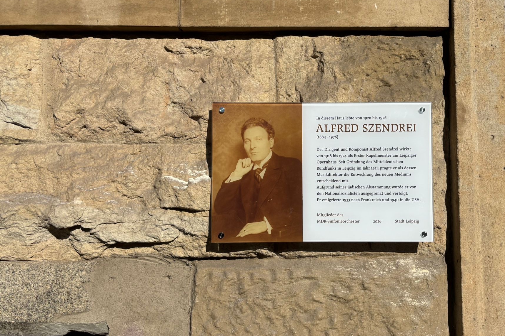 Die Stadt Leipzig und das MDR-Sinfonieorchester würdigen heute an dessen 50. Todestag den Dirigenten und Komponisten Alfred Szendrei (1884–1976), der von 1918 bis 1924 als Erster Kapellmeister am Leipziger Opernhaus tätig war. Ihm zu Ehren wurde am Morgen in der Duforstraße 38, wo er von 1920 bis 1926 lebte, eine Gedenktafel eingeweiht, geschaffen von der Leipziger Künstlerin Franziska Neubert.