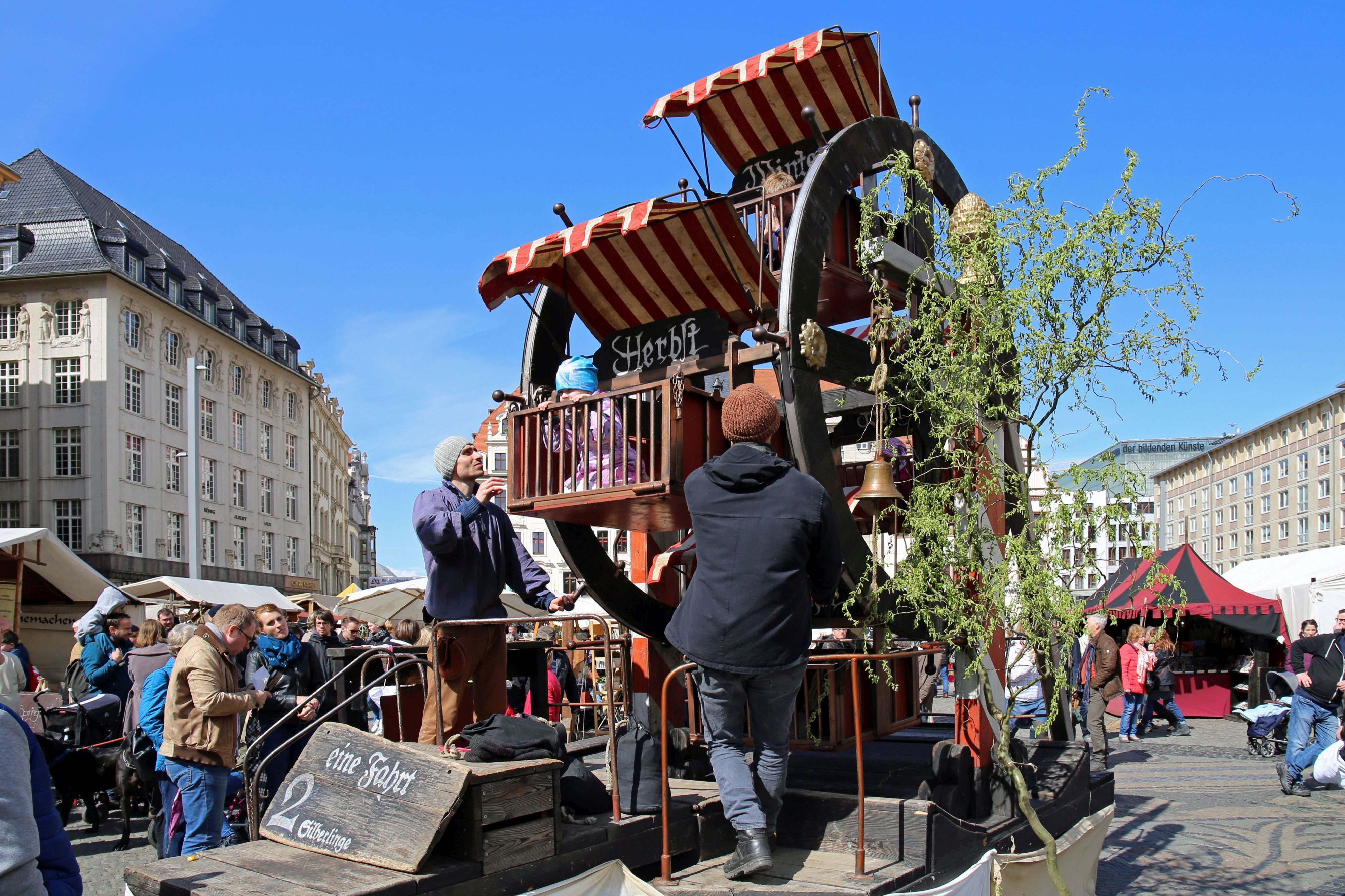 Mit dem Start der historischen Ostermesse vor dem Alten Rathaus beginnt heute ein munteres Markt-Vertreiben in der Innenstadt. Denn wo einer ist, kann ein zweiter nicht sein. Der beliebte Wochenmarkt in Leipzigs City muss in diesem Jahr wieder mehrfach verlegt werden (bleibt jedoch grundsätzlich bei seinen gewohnten Öffnungszeiten dienstags und freitags von 9 bis 17 Uhr). Bereits heute und am 2. April weichen die Händler wegen des Ostermarktes auf den Augustusplatz aus. Aufgrund des Karfreitages am 3. April wird der Freitagstermin zudem auf Gründonnerstag, den 2. April, vorgezogen.