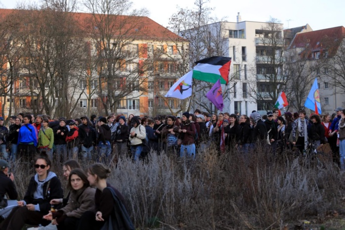 Obwohl im Demokonsens festgehalten war, dass National- und Territorialflaggen unerwünscht sind, wurden auf der Karl-Liebknecht-Straße mehrere palästinensische Flaggen gezeigt. Nach Informationen der Leipziger Zeitung wurden mehrere Aufforderungen der Veranstalter*innen, das zu unterlassen, ignoriert. Die Polizei kesselte daraufhin den Block ein und führte ihn zu einer kleineren, pro-palästinensischen Kundgebung am Alexis-Schumann-Platz.