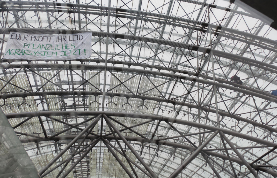 Mit einer Kletteraktion zur Landwirtschaftsmesse haben Aktivistinnen und Aktivisten der Tierrechts-Gruppierung „Animal Rebellion“ am Freitagmorgen einmal mehr für Aufmerksamkeit gesorgt: Zwei Personen erklommen die Stahlkonstruktion der Glashalle auf dem Neuen Messegelände, um dort gegen 09:00 Uhr ein weithin sichtbares Banner mit der Aufschrift „Euer Profit, Ihr Leid – Pflanzliches Agrarsystem Jetzt“ anzubringen. Anschließend kletterte das Duo herab und erhielt nach eigenen Angaben einen Platzverweis durch die Polizei.