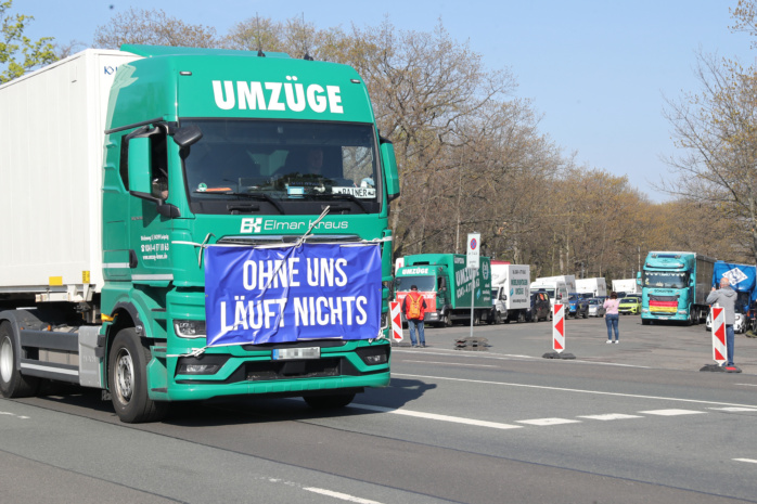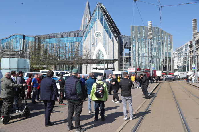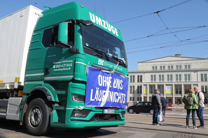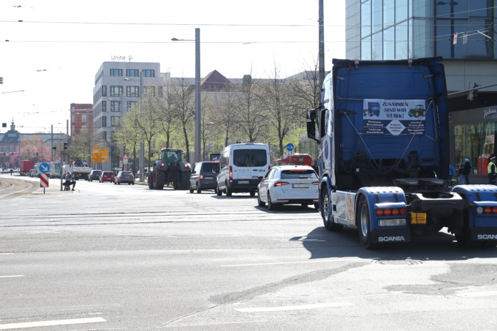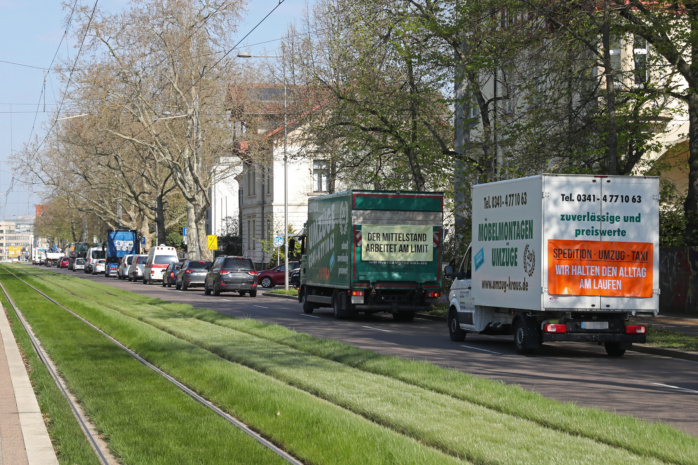 Laut hupend rollten am heutigen Vormittag etwa 100 Kraftfahrzeuge im Konvoi durch Leipzigs City. Unter dem Motto „Ohne uns läuft nichts!“ machten Speditionen, Umzugsunternehmen, Taxifahrer, Handwerker und Transporteure mit dieser Aktion auf schwierige Bedingungen in ihren Branchen aufmerksam. Durch stark gestiegene finanzielle Aufwendungen sehen sie den Mittelstand in Gefahr. Sie forderten daher unter anderem: „Kraftstoffkosten runter!“, „Lohnnebenkosten runter!“, „CO2-Steuer abschaffen!“ und ähnliches.