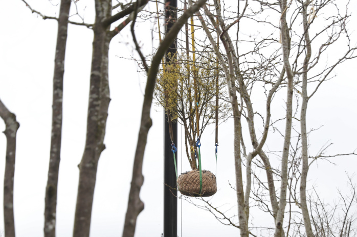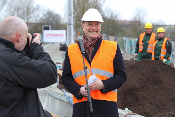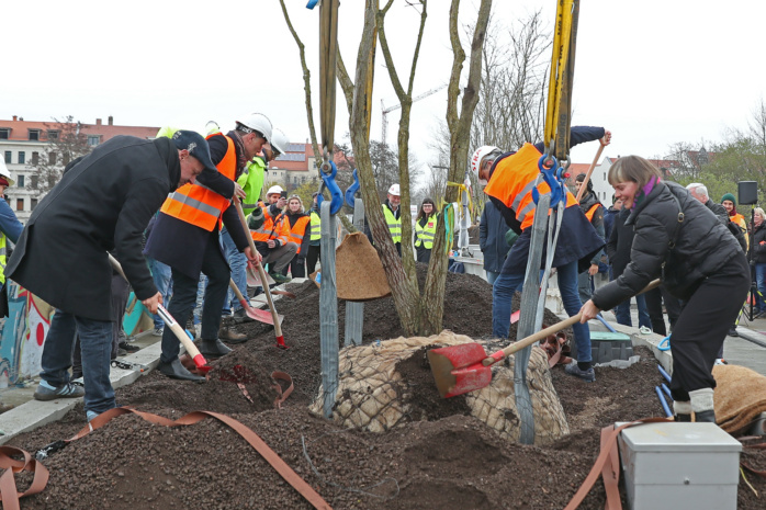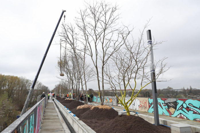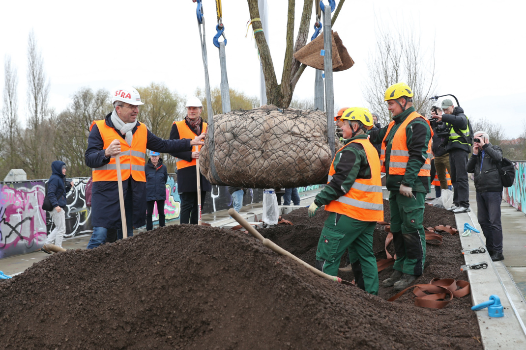 Mit Heiko Rosenthal (Umwelt, Klima, Ordnung und Sport) sowie Thomas Dienberg (Stadtentwicklung und Bau) verschafften sich am heutigen Mittwoch gleich zwei Leipziger Bürgermeister vor Ort einen Eindruck vom aktuellen Stand der Arbeiten. Gemeinsam mit einigen Stadträt/-innen halfen sie symbolisch bei der Pflanzung einer Blasenesche, die per Kran aus luftiger Höhe heranschwebte und eingesetzt wurde. Für Deutschland ist es ein bisher einmaliger Vorgang, dass auf einer Brücke Bäume eingepflanzt werden.