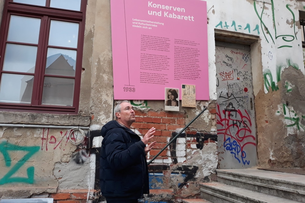 Liest man den Text auf jener Tafel, die den Zeitraum von 1921 bis 1933 umfasst, fühlt man sich fast in die Gegenwart versetzt. Darauf ist von Wohnungsnot, steigenden Mieten und einem vielfältigen Kulturangebot auf dem ehemaligen Brauereigelände zu lesen. Es folgte ein „dunkles Kapitel“ im Nationalsozialismus, in dem die Feinkost zur Unterbringung von Zwangsarbeitern genutzt wurde. In der DDR wurden anschließend mehrere Jahrzehnte lang Konserven hergestellt.