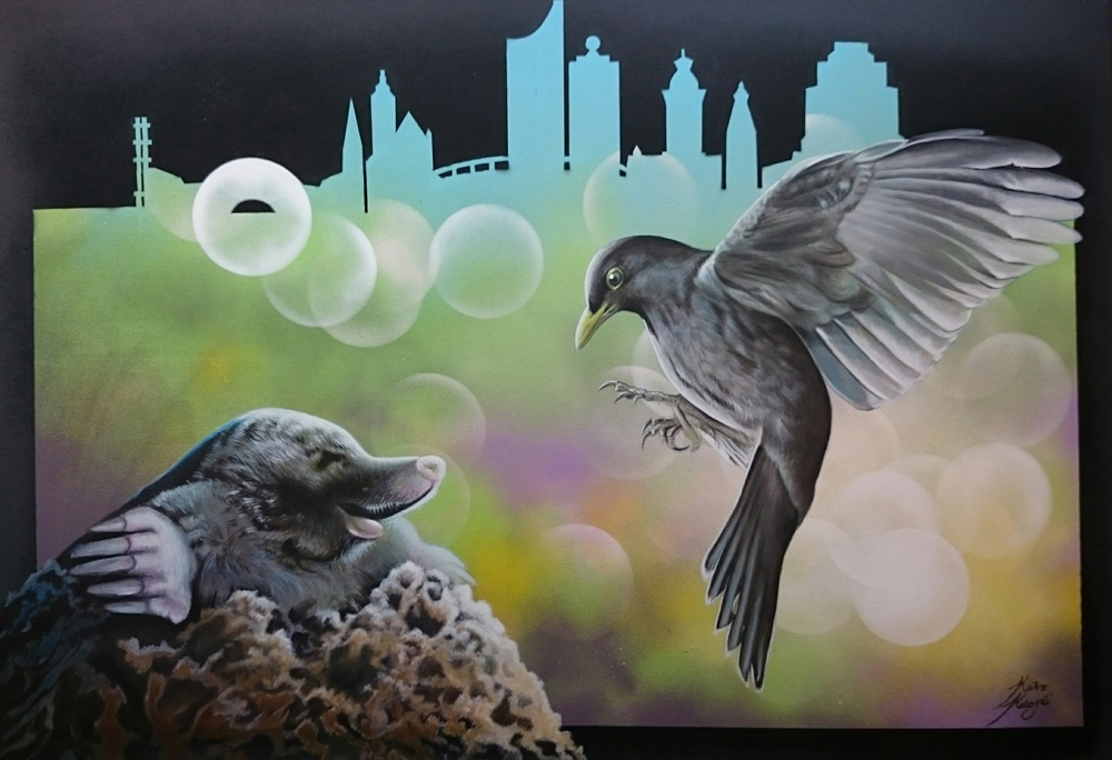 Kamilla Kubaczynski stellt dabei mit ihren Bildern einige ausgewählte Arten vor, die speziell in Leipzig besonders häufig anzutreffen sind. Verschiedene Techniken aus Schablonen, Aerosolkunst und Siebdruck sollen auf die allgegenwärtige “Streetart-Szene” in Leipzig hindeuten, die das Stadtbild prägt und lebendig macht. Die “Tierischen Nachbarn” sollen den Besuchern die urbane Biodiversität als Teil der Lebensqualität veranschaulichen.