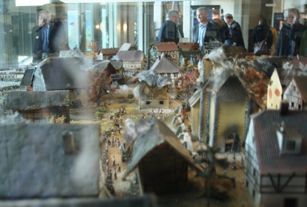 Das 15 Quadratmeter große Schaubild des zerstörten Probstheida – nach zeitgenössischen Schilderungen detailgetreu nachgebaut – ist der eindrucksvolle Abschluss (oder Beginn) des Rundgangs.