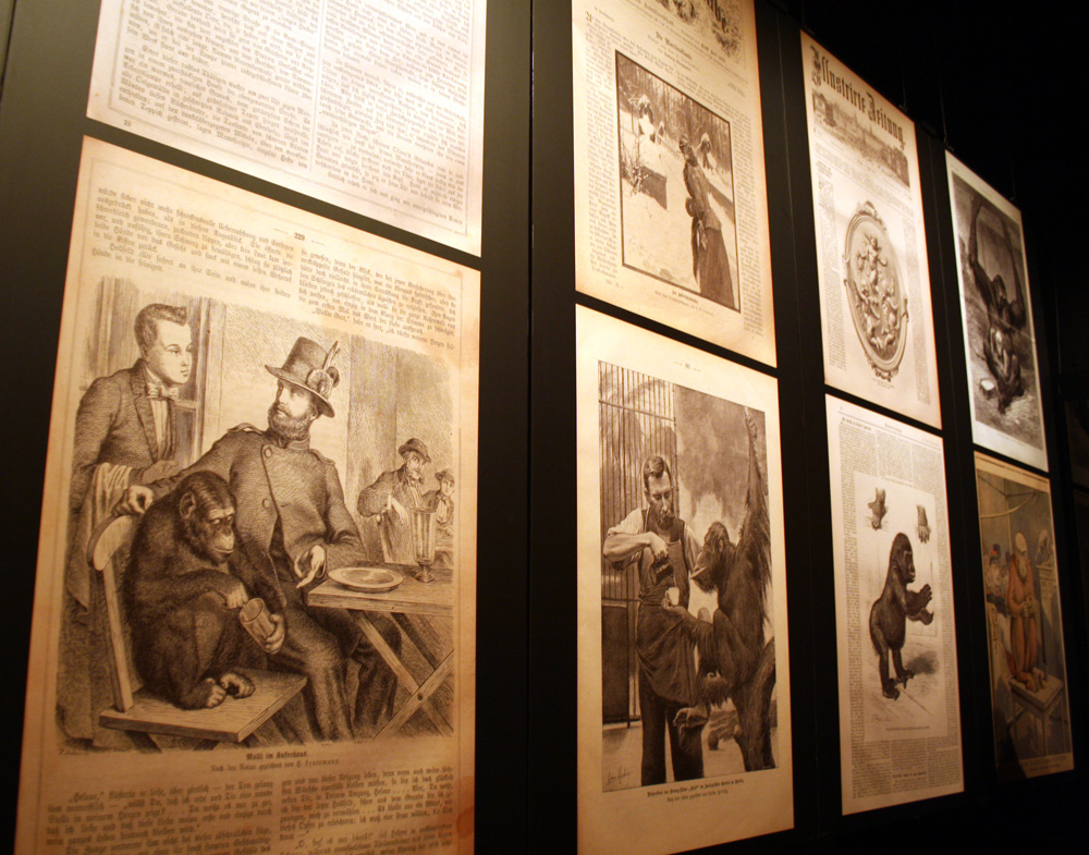 Aber die Bücher vermitteln nicht nur die zunehmende wissenschaftliche Arbeit mit den uns so ähnlichen Tieren, sie beinhalten auch Geschichten über Geschichten, wie Mustafa Haikal betont. Die hat er vor allem im Begleitkatalog erzählt, der im Passage Verlag erscheint und den wir an dieser Stelle in Kürze auch besprechen werden. Aber die Studierenden, die die Ausstellung gestaltet haben, haben viele dieser Geschichten für den Besucher auch greifbar gemacht – wie die Geschichte der beiden Orang-Utans, die der Leipziger Zoodirektor Ernst Pinkert für den Zoo erwarb, die sich aber bei ihrer Ankunft in Paris fürchterlich erkälteten und binnen weniger Wochen starben.