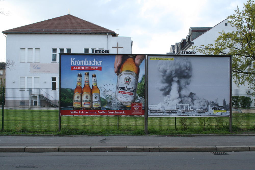 Insbesondere jene Leipziger, die seit gestern durch die Rosa-Luxemburg-Straße gefahren sind, haben ein paar großformatige Plakate gesehen, wie man sie auch in Leipzig eher seltener im Straßenraum sieht. Für gut eine Woche - vom 26. April bis 5. Mai 2016 - zeigt der Fotograf Stefan Koppelkamm im Leipziger Stadtraum fünf Bilder der Zerstörung. Praktisch parallel zu einer Ausstellung im Museum der bildenden Künste.