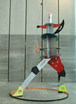 Und da er Maler ist, wird er – gefragt nach dem philosophischen Hintergrund seiner Arbeiten – sehr wortkarg oder weicht lieber listig aus und preist die hübschen Dinge an, die man im Buchshop des Bildermuseums kaufen kann. Den dicken Katalog zum Beispiel, den wir an dieser Stelle natürlich auch noch besprechen werden. Oder die kleinen Plastiken, die er entwickelt hat und die man zusammenbauen kann wie Steckfiguren.