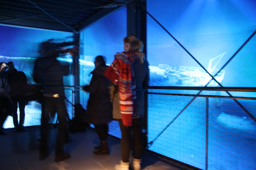 Doch schwere Hintergrundmusik lenkt freilich nicht davon ab, was für ein gewaltiges Ungetüm sich da in den Meeresgrund gebohrt hat. Das Licht ändert sich nur allmählich. Erst wenn es lebhafter wird, wechselt auch die Musik, mischt sich das tiefe Röhren der Schiffssirenen in den Sound und die dramatischen Momente werden spürbar, in denen das hoch beschleunigte Schiff versuchte abzubremsen, während es direkt auf den Eisberg zusteuerte – und im Saal ging die Party weiter, spielte das Orchester. Die Rettungsaktivitäten begannen viel zu spät, vertrödelte wertvolle Zeit, die 1.500 Passagieren zum Verhängnis wurde. Am Ende vermischen sich Hektik, Musik, Verzweiflung in einem Klangteppich. Und dann wird’s finster.