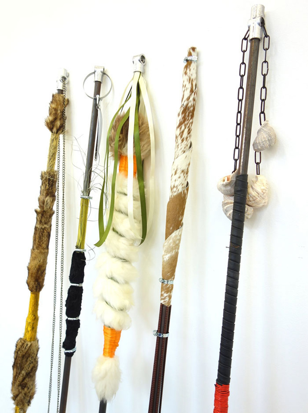 Am dichtesten am Ritual sind die „Thyrsoi“ (2016/17). Die zwei Meter langen, aufwendig gestalteten Stahlrohre haben erkennbare Ähnlichkeit mit dem Bachantenstab, der Insignie vor allem des Dionysos, Gott des Weines, der Freude, der Fruchtbarkeit, aber auch des Ausschweifenden Genusses, des Wahnsinns und der Ekstase. In überlieferten Darstellungen bezeichnet der Thyrsos mit seinen kunstvollen Bekrönungen aus Efeu und Weinlaub die göttliche Sphäre und ausschweifende Genuss-Orgien. Und er verbindet das Zeichen göttlicher Macht mit rauschhafter Vitalität, Sorglosigkeit aber auch der Wehrhaftigkeit einer speerartigen Waffe. Als derart komplexes Attribut ist der Thyrsos im Idealzustand, Kultobjekt der gegenwärtigen Partygesellschaft zu sein. Der „Feierstab“, der sich heute als Zubehör auf ekstatischen Musikfestivals wiederfindet, hat bei Klara Meinhardt seine Ecken und Kanten. Schrauben, metallische Verbundstücke, Rohrelemente und Stahlketten machen das zeitlose Symbol zum ambivalenten Sinnbild des technischen Fortschrittsglaubens und der Sehnsucht nach einer höheren lebensweltlichen Ordnung.