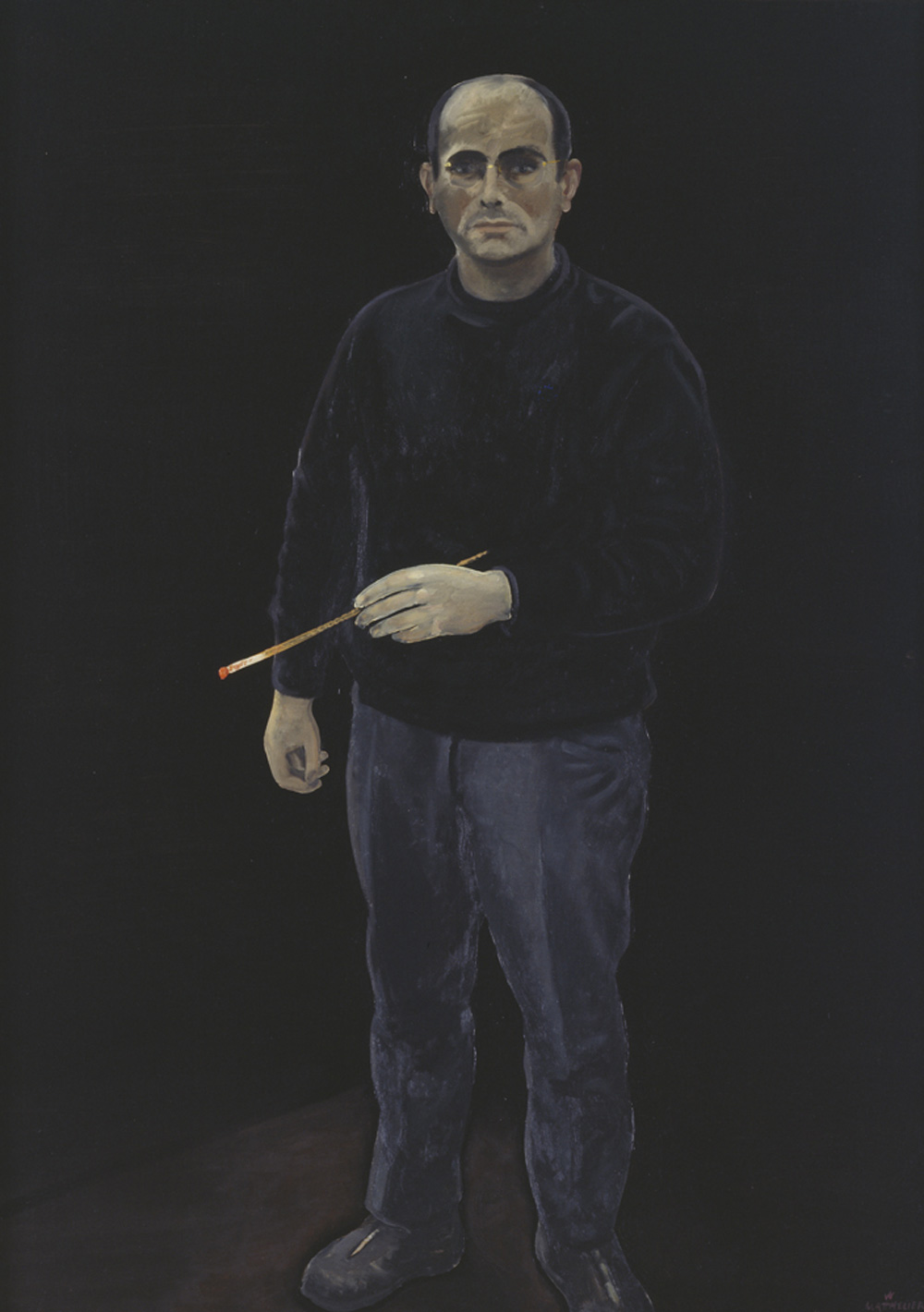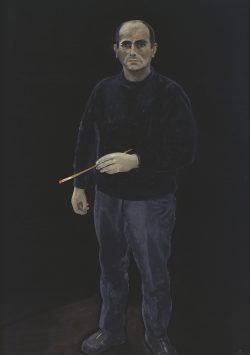 In der Ausstellung zu sehen sein werden unter anderem zwei dunkle Gemälde, die die Selbstverortung zwischen Hoffen und Resignation verbildlichen, kündigt die Galerie an. Das Selbstporträt von 1971 ist eins der wenigen direkten Selbstbildnisse des Künstlers, der sich in voller Figur und mit Pinsel in der Hand in einem fast schwarzen Atelierraum abbildet. Regungslos blickt er dem Betrachter entgegen, einzig die rote Farbe auf dem Pinsel verheißt den Aufbruch in eine eigene – eine bessere? – Realität.