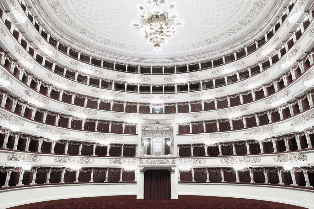 Auf seinen Reisen von Südtirol bis Sizilien fotografierte Schaller vom Bühnenraum aus in stets gleicher Perspektive und montierte in alle Bilder dasselbe Parkett. Damit unterstreicht er den Eindruck der baulichen Ähnlichkeit der Opernsäle, die allesamt während des Risorgimento – der italienischen Einigungsbewegung im 19. Jahrhundert – erbaut wurden.